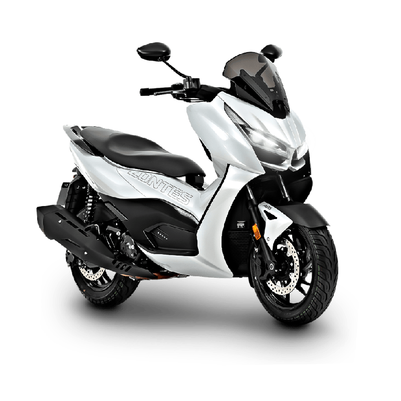 La Zontes D350 es una propuesta moderna en el segmento de los maxiscooters. Equipa un motor de 349 cc, refrigerado por líquido, con más de 36 CV, y un diseño aerodinámico con parabrisas regulable eléctricamente. Incorpora frenos ABS, arranque sin llave, iluminación full LED, conectividad avanzada y tablero TFT con Bluetooth. Su postura de conducción relajada y espacio para dos cascos integrales lo hacen ideal para ciudad, trayectos largos y desplazamientos diarios con estilo y confort.